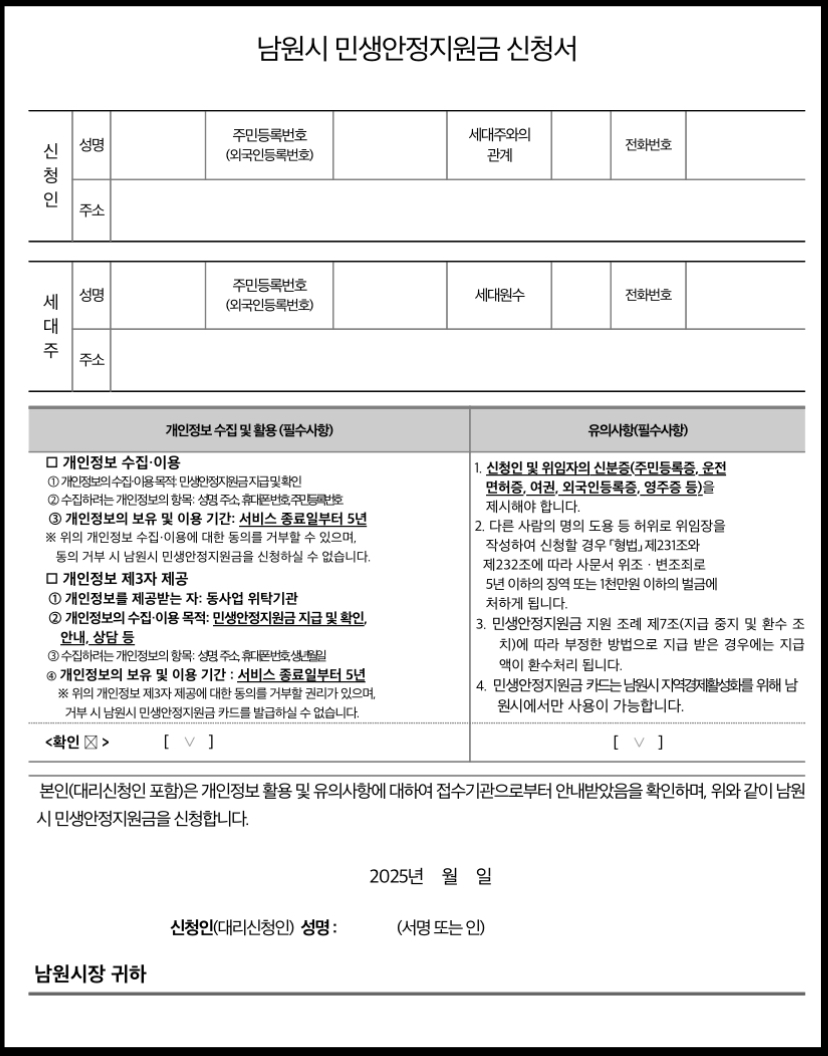 장기화된 경기침체 속에서 고통받는 시민들의 민생안정과 지역 경제 활성화를 위한 긴급대책으로 전 시민을 대상으로 남원시 민생안정지원금을 지급합니다.