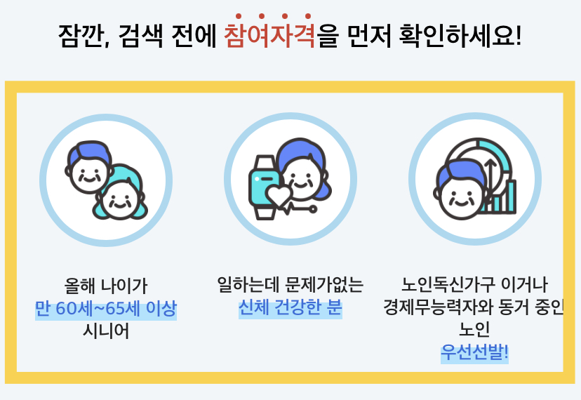 참여자격은 올해 나이가 만 60세~65세 이상의 시니어, 일하시는데 문제가없는 신체 건강한 분, 노인독신가구 이거나 경제무능력자와 동거 중인 노인은 우선선발 합니다.