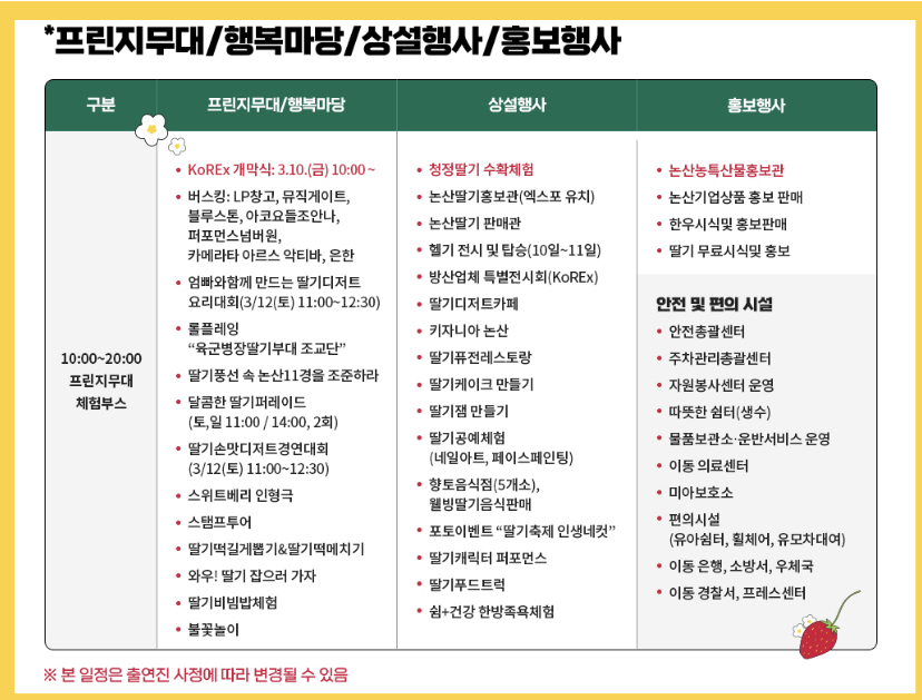 충남 논산시는 문화관광재단과 딸기축제운영위원회를 중심으로 오는 3월 8일부터 3월 12일까지 지역 축제인 딸기축제를 개막합니다. 논산시는 4년 만의 대면 축제를 성공적으로 치르기 위해서 이번 딸기 축제를 기존에 많은 사랑을 받았던 인기 프로그램 재단장하는 동시에 MZ세대 맞춤형 프로그램을 기획해 남녀노소가 즐길 수 있는 축제로 만들겠다는 계획입니다. 그럼 논산 딸기축제 딸기체험 헬기 탑승체험 가수 정보에 대해 자세히 알아보도록 하겠습니다.