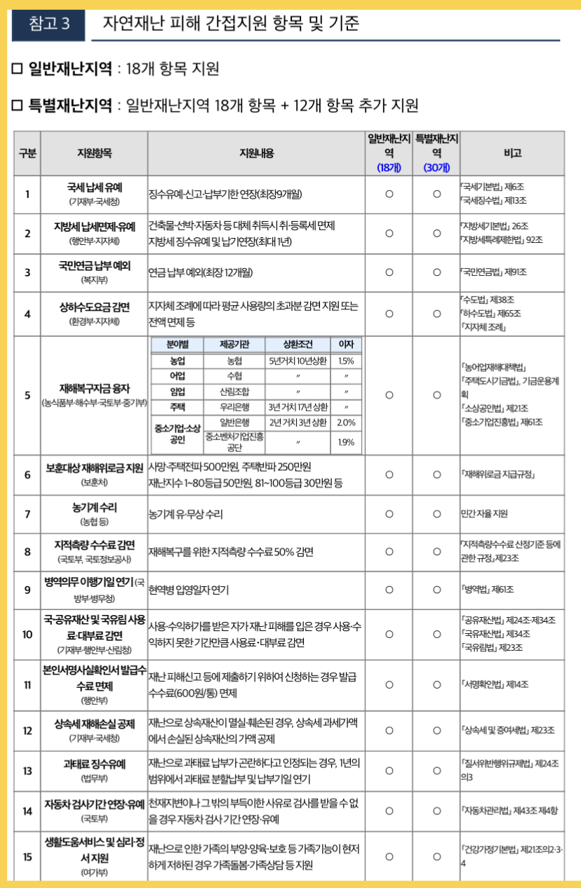 - 그리고, 피해 주민의 생계안정을 위해 재난지원금 지급과 함께 행정·재정·금융·의료상 총 30종의 간접 지원도 제공되며, 건강보험·전기·통신·도시가스·지방난방요금 감면 등이 해당됩니다.