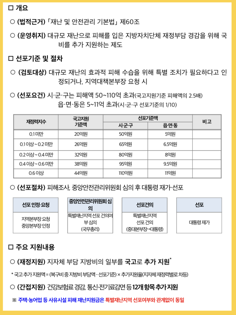 - 특별재난지역으로 선포되면 피해 복구비 중 지방비 부담분의 50~80%를 국고로 지원받게 된다. 지자체의 재정 부담을 덜게 돼 피해시설 복구와 주민 생활안정 지원이 차질없이 추진될 수 있습니다.