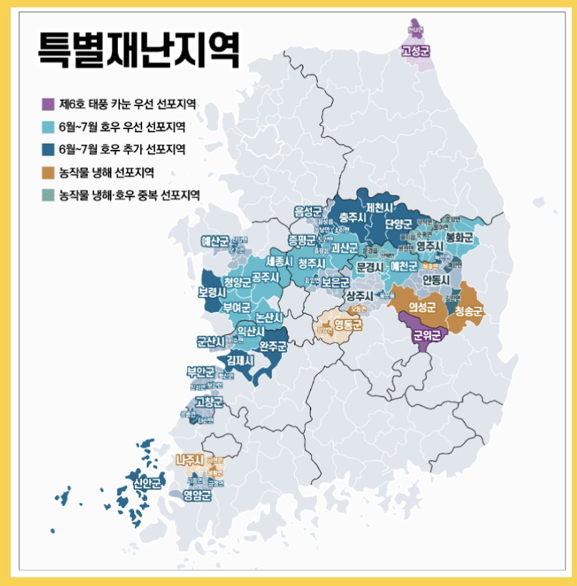 또한, 지난 7월 집중호우로 피해를 본 7개 시·군과 20개 읍·면은 추가 선포가 되었으며, 지난 4월 농작물 냉해 피해를 입은 2개 군과 15개 읍·면도 특별재난지역으로 선포되었는데요. 농작물 냉해 피해에 대한 특별재난지역 선포는 역사상 최초입니다.