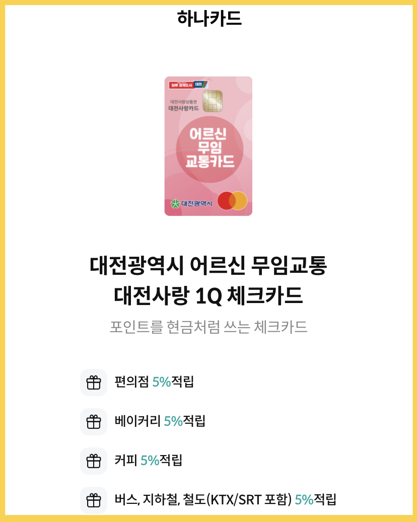 - 기능: 무임교통카드 + 대전사랑카드 / 대전지역 사용