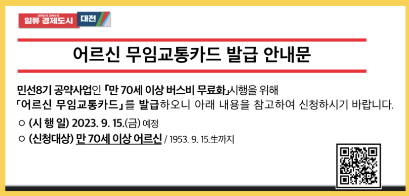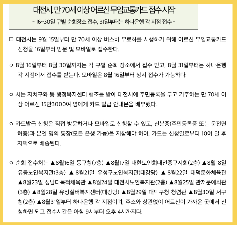 대전시는 9월 15일부터 만 70세 이상 버스비 무료화를 시행하기 위해 어르신 무임교통카드 신청을 8월 16일부터 받습니다. 방문 및 모바일로 접수한다고 하니 대전에 거주하시는 만 70세 이상의 노인분들이라면 신청하시기 바랍니다. 그럼 대전시 무임교통카드 신청방법 혜택에 대해 자세히 알아보도록 하겠습니다.