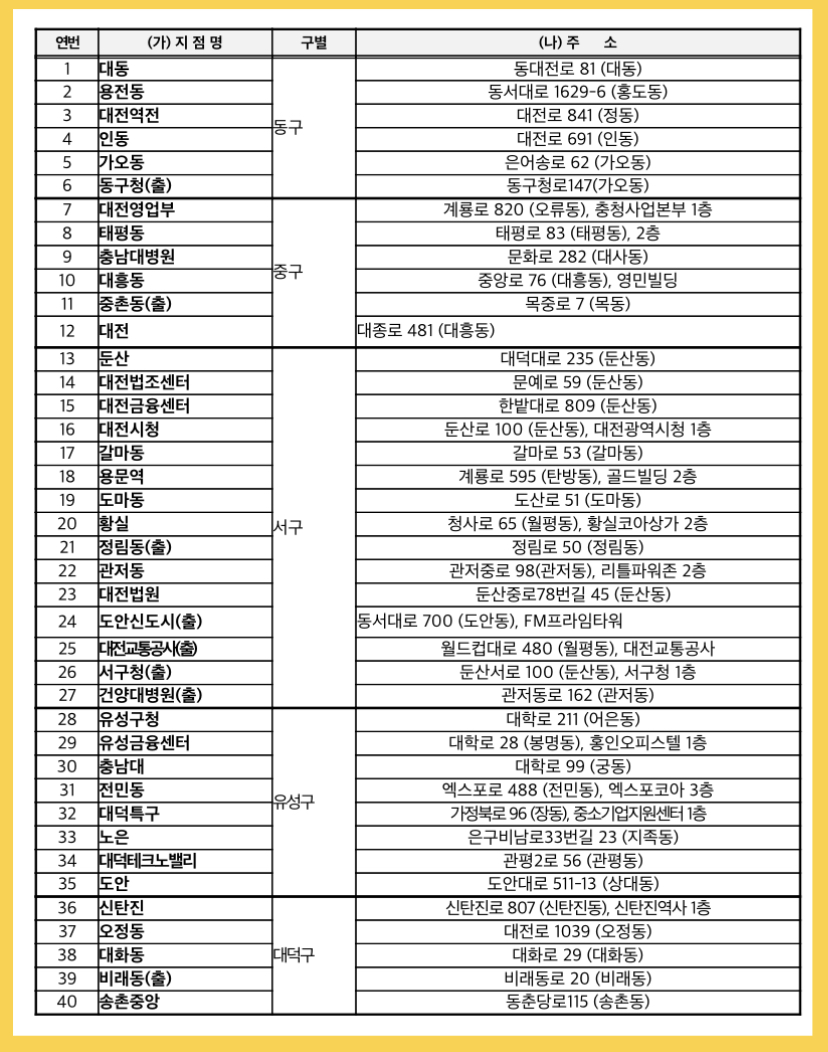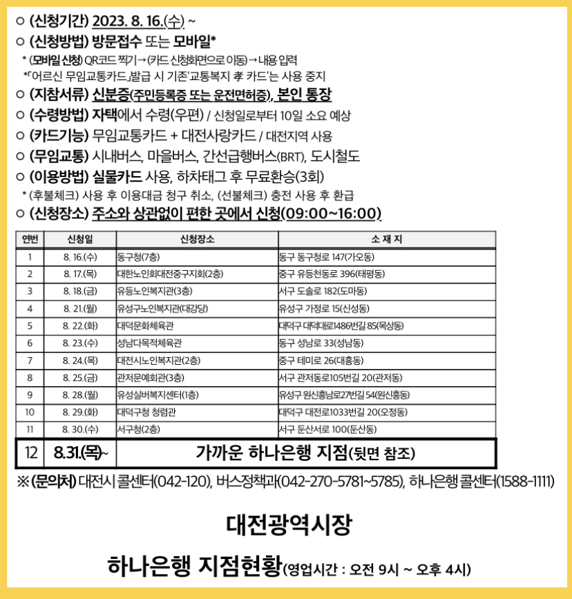 - 문의처: 대전시 콜센터(042-120), 버스정책과(042-270-5781~5785), 하나은행 콜센터(1588-1111)