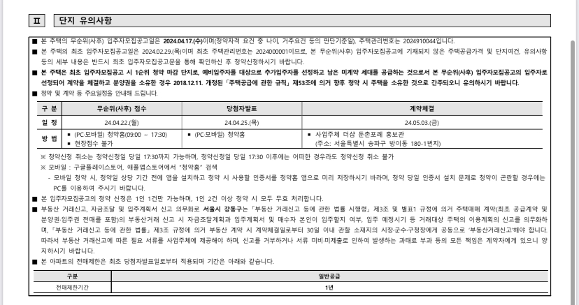 더샵 둔촌포레 무순위 청약 접수일정은 2024년 4월 22일(월)입니다. 당첨자 발표일은 4월 25일(목)이며, 계약체결은 5월 3일(금) 진행됩니다.