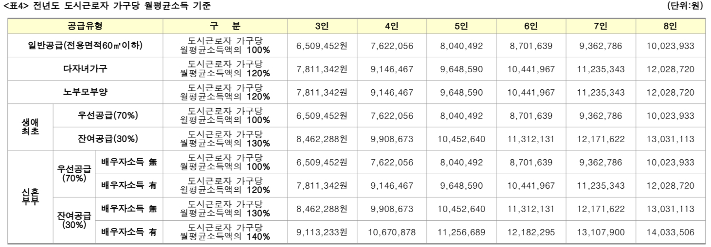 • 일반공급: 100% 이하의 가구당 월평균 소득 기준을 충족해야 신청이 가능합니다.