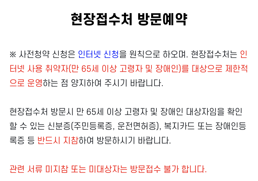 현장접수처는 방문예약을 신청한 인터넷 사용 취약자인 만 65세 이상 고령자 및 장애인을 대상으로 제한적으로 운영하니 주의하시기 바랍니다.