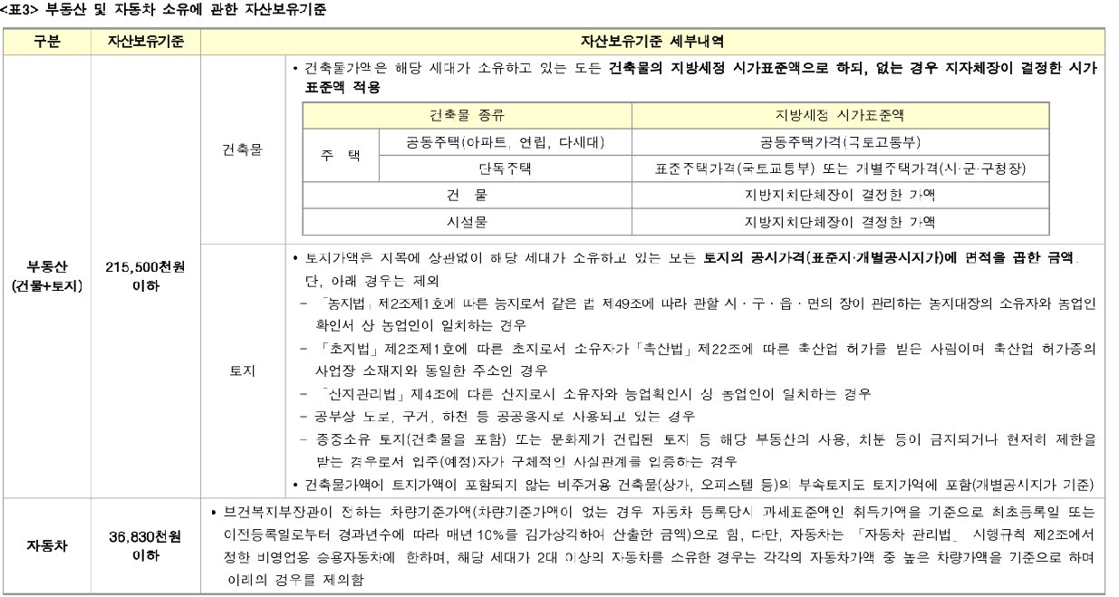 부동산 (건물+토지) 2억1550만원 이하이고, 자동차는 3천683만원 이하입니다.