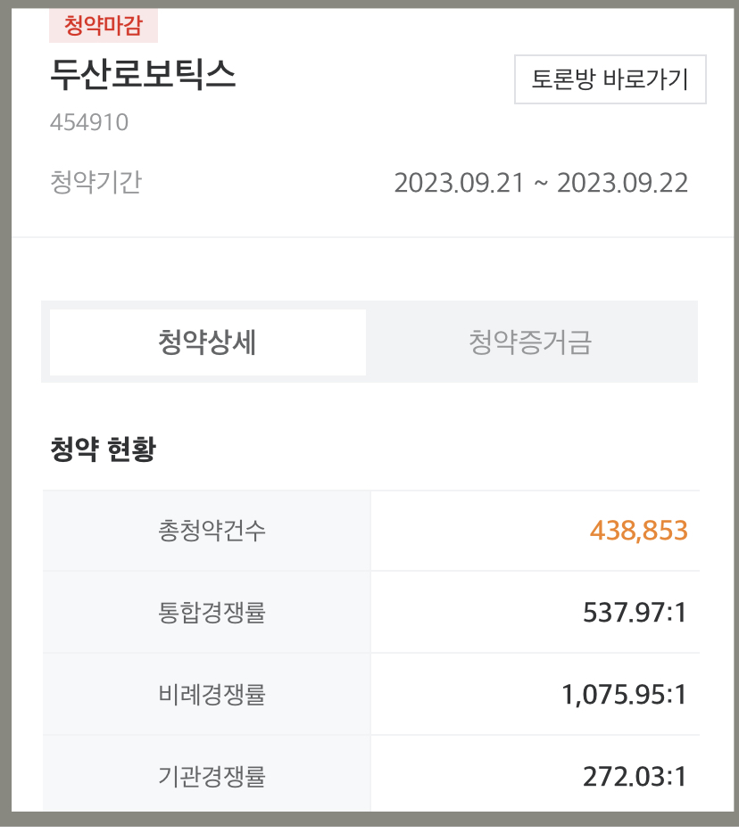 두산로보틱스의 공모가는 26,000원인데요. 고평가 논란도 있었지만, 희망공모가 범위 상단에 공모가가 정해졌습니다. 일반 청약경쟁률 524.05대 1에 청약증거금 33조1093억원이 몰리며 흥행에 성공했습니다. 공모가 기준 예상 시가총액은 1조6853억원이고 현재 코스닥 로봇 대장주인 레인보우로보틱스의 시가총액은 약 2조9800억원입니다.
