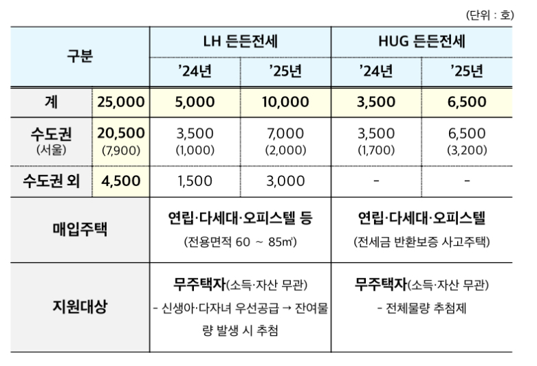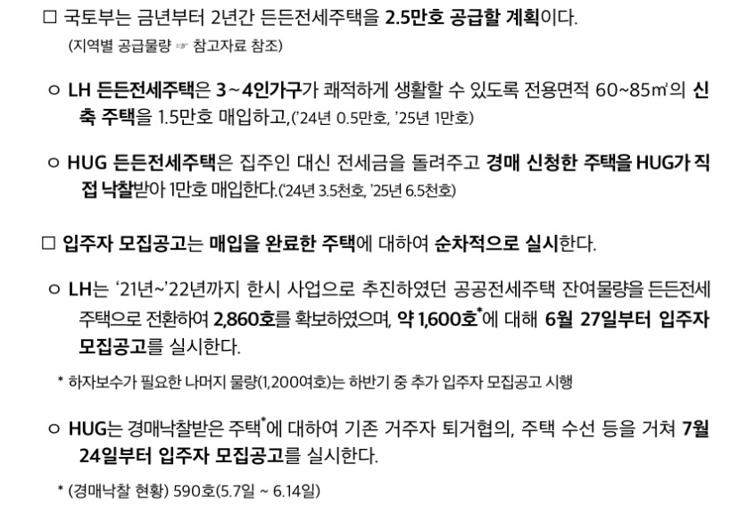 이 주택들은 HUG에서 집주인 대신 전세보증금을 돌려주고 경매 신청한 주택을 직접 낙찰받은 것으로 지난 3월 19일 대통령 주재 민생토론회 당시 국토교통부에서 발표한 도시 공간·거주·품격 3대 혁신 방안에 담긴 대책 중 하나입니다. 이에 따라 HUG는 2024년 3500호, 2025년 6500호를 공급해 2년간 총 1만 호를 공급할 예정입니다.
