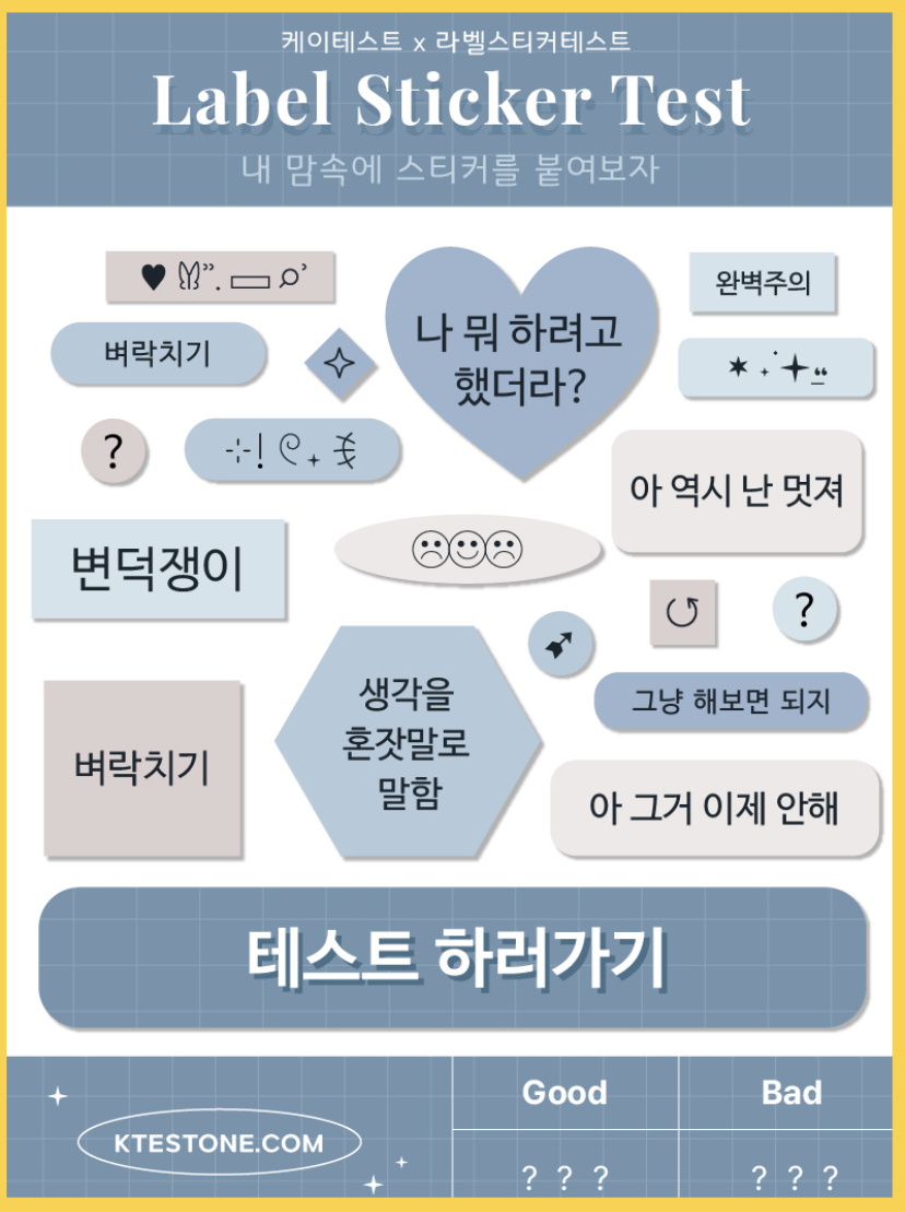 라벨스티커 테스트 mbti는 케이테스트에서 만든 최신 테스트입니다. 3분 정도면 간단하게 테스트를 해 볼 수 있습니다. 많은 인기를 누리고 있는 만큼 많은분들이 테스트에 도전해보고 있는데요. 그럼 테스트 시작해 보겠습니다.