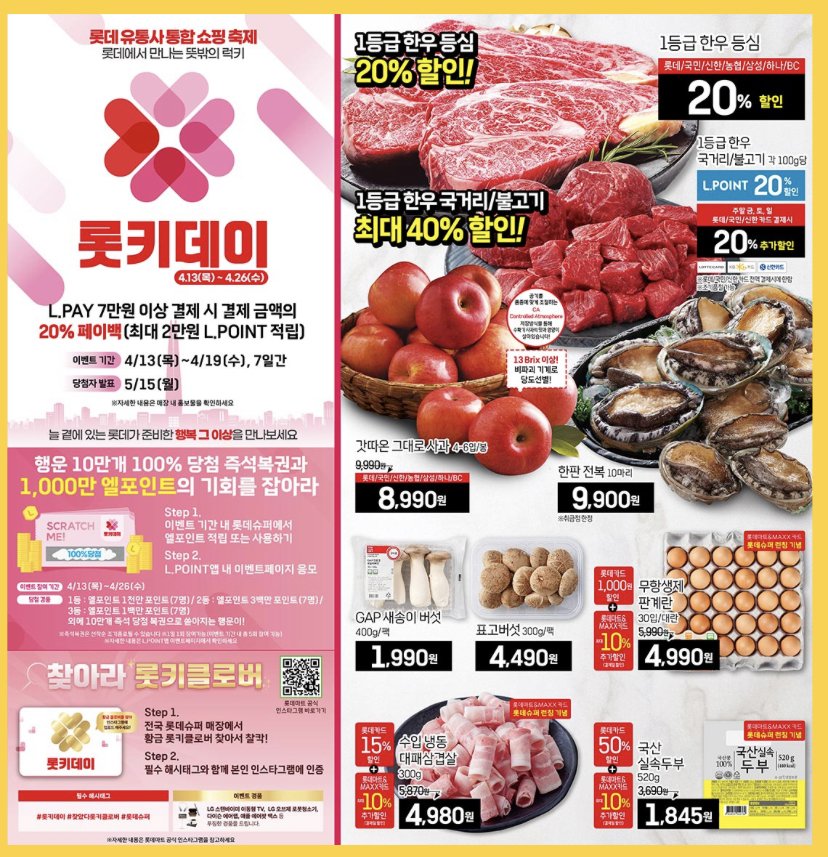 롯데는 4월 13일부터 26일까지 고물가 고금리에 인해 부담을 덜기 위해 롯데 8개 계열사인 롯데백화점, 롯데마트, 롯데슈퍼, 롯데온, 롯데홈쇼핑, 하이마트, 세븐일레븐에서 할인 행사를 진행합니다. 그럼 롯키데이 롯데마트 롯데백화점 롯데슈퍼 할인 행사에 대해 자세히 알아보도록 하겠습니다.