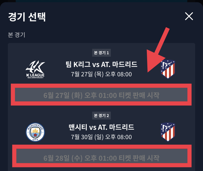 티켓 예매는 6월 27일부터 28일까지 이틀간 오후 1시에 순차적으로 진행됩니다. 쿠팡플레이 시리즈에 참가하는 맨체스터 시티와 아틀레티코 마드리드 그리고 팀 K리그 3개 팀의 오픈 트레이닝 일정과 장소도 공개되었는데요.