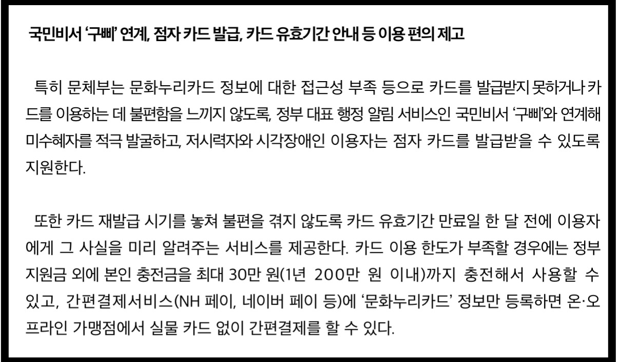 문체부는 문화누리카드 정보에 대한 접근성 부족 등으로 카드를 발급받지 못하거나 카드를 이용하는 데 불편함을 느끼지 않도록 정부 대표 행정 알림 서비스인 국민비서 '구삐'와 연계해 미수혜자를 적극 발굴하고, 저시력자와 시각장애인 이용자는 점자 카드를 발급받을 수 있도록 지원합니다.