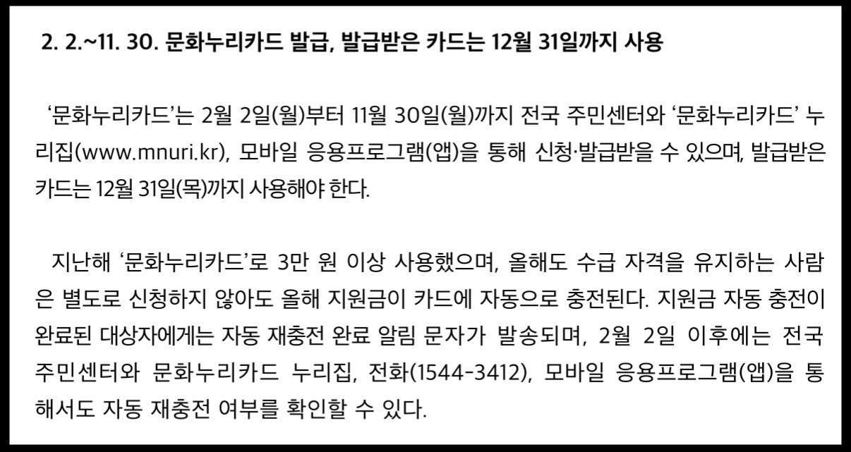 2025년 문화누리카드로 3만 원 이상 사용했으며 올해도 수급 자격을 유지하는 사람은 별도로 신청하지 않아도 올해 지원금이 카드에 자동으로 충전됩니다.