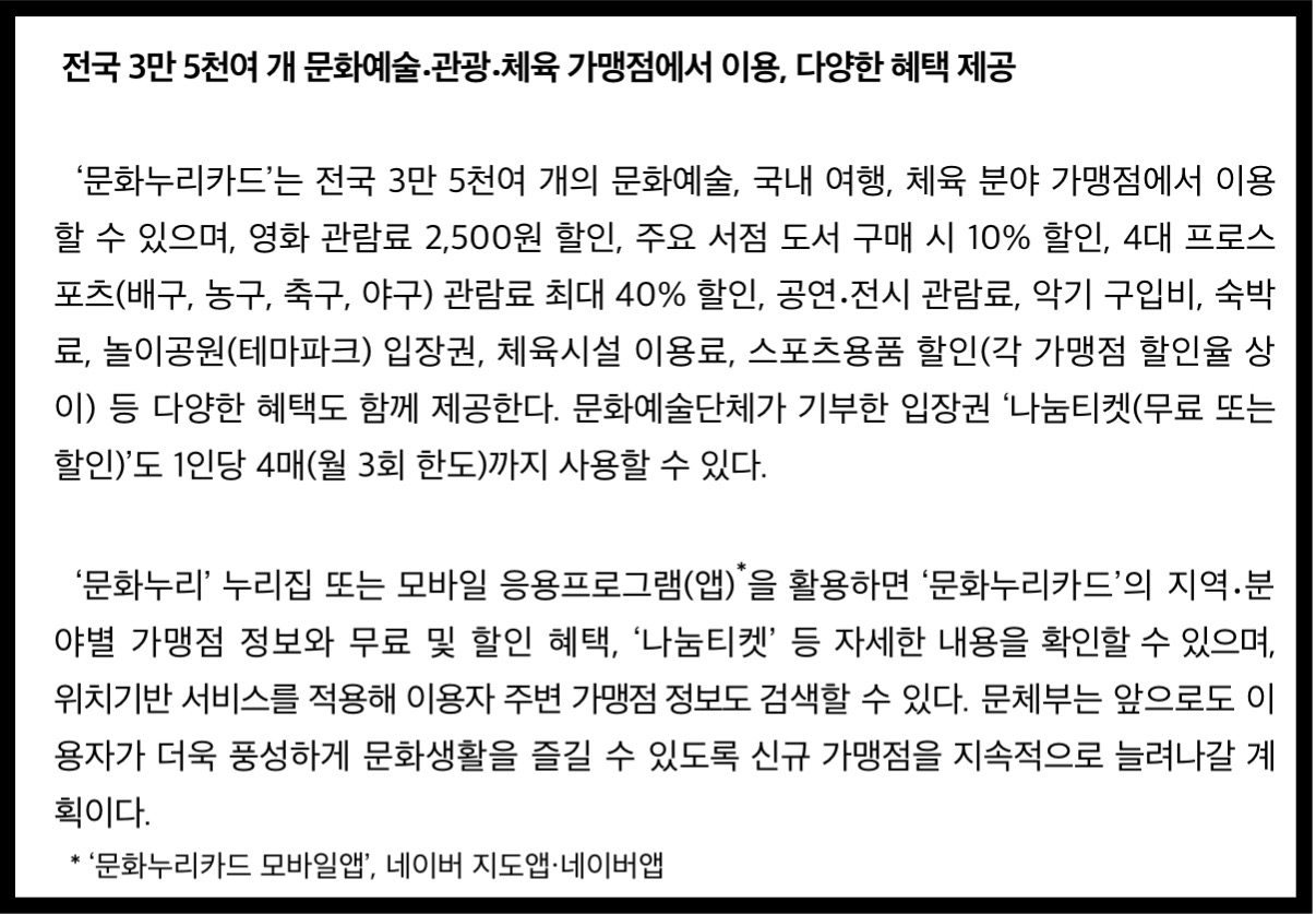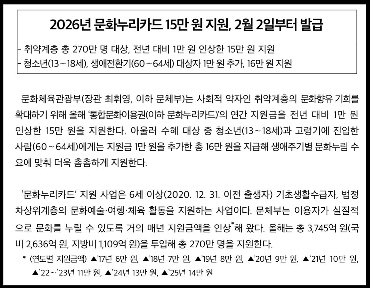 문화체육관광부와 한국문화예술위원회는 취약계층의 문화 향유권을 향상시키기 위해 2일부터 문화누리카드 발급을 개시하며, 지원 규모 확대와 이용 편의성 개선 등 제도 전반을 한층 강화합니다. 그럼 문화누리카드 누리집 신청방법 가맹점 홈페이지에 대해 자세히 알아보겠습니다.