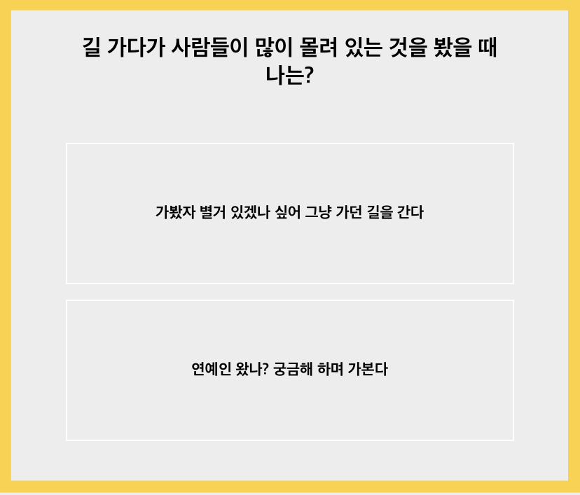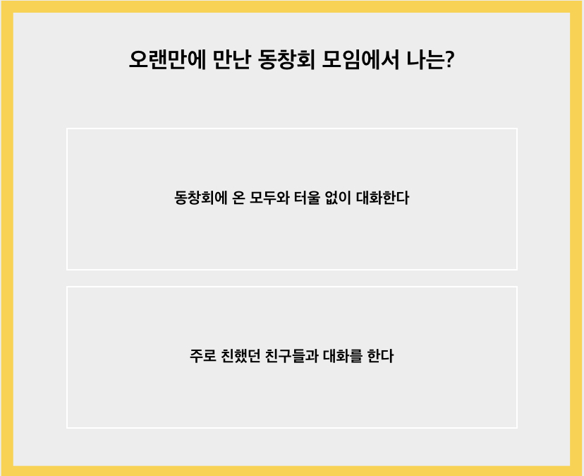 ‘오랜만에 만난 동창회 모임에서 나는?’이라는 질문인데요. 실제로 오랜만에 만나 초등 동창회 모임 때를 떠올려보니 주로 친했던 친구들과 이야기를 길게 나누었던 것 같습니다. 아무래도 저는 mbti가 infj 인프제라서 그런지 많은 사람들 앞에 서는 것보다 한두 명의 개개인과 대화 나누는 것이 더 편합니다.