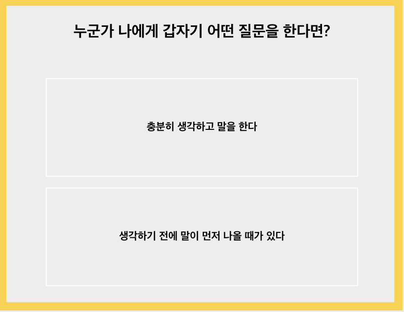 누군가 나에게 갑자기 어떤 질문을 하면 충분히 생각해서 정리한 후에 대답을 하는 스타일입니다. 생각하기 전에 말이 먼저 나오는 경우는 정말 극히 드물답니다.