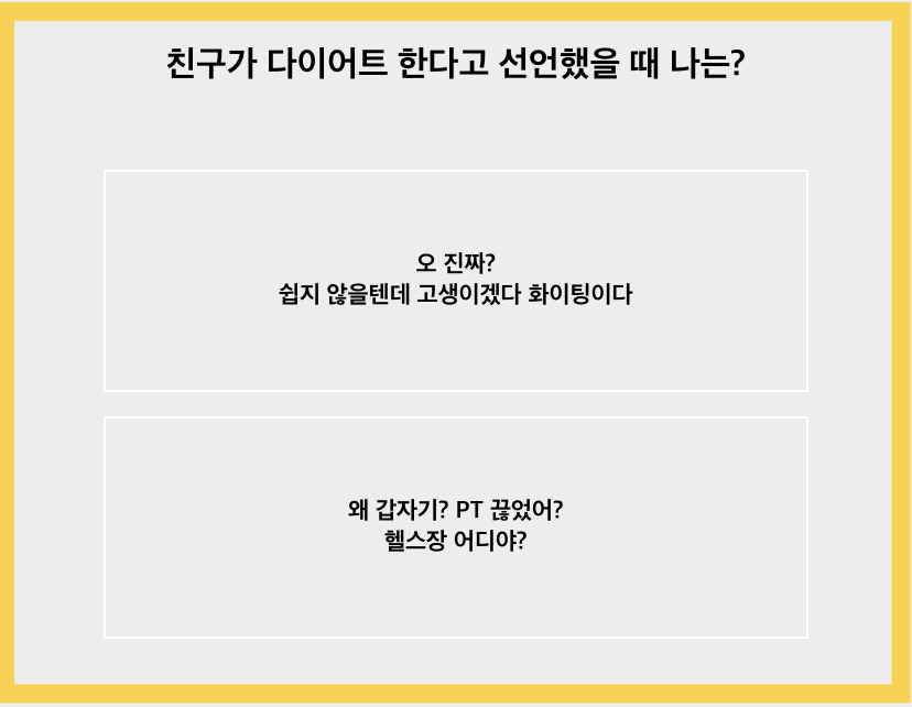 친구가 다이어트를 한다고 선언하면 대부분은 “나도 해야겠다”라고 말하며 “진짜 쉽지 않을 텐대”라고 얘기하며 응원해 줄 것 같습니다. 물륜 헬스장이 궁금하기도 하지만 그건 차차 나중에 물어볼 것 같습니다.