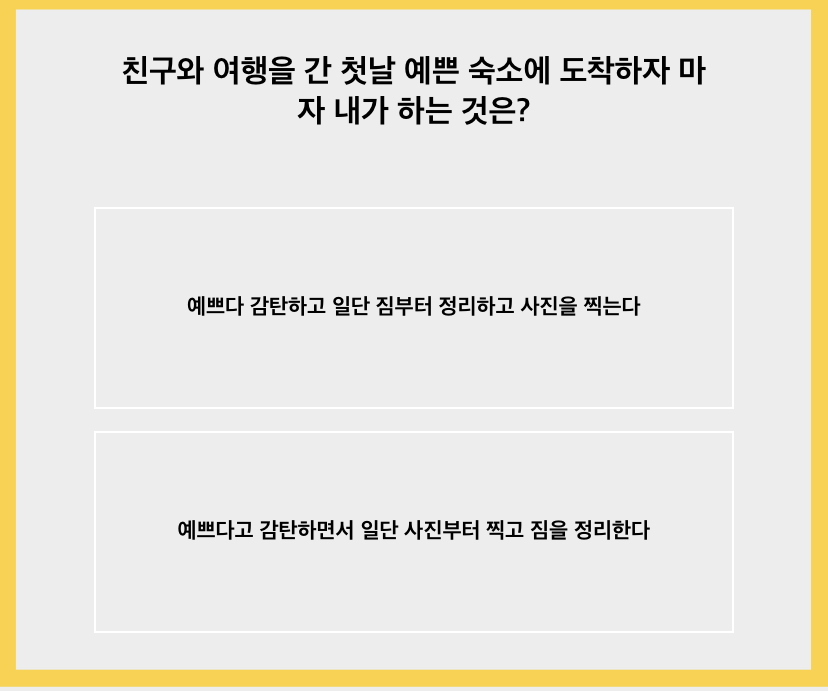 친구와 여행을 가는 첫날 예쁜 숙소에 도착하자마자 내가 하는 것은? 입구에서부터 너무 예쁘다고 감탄을 하며 사진부터 찍고 정리를 시작할 것 같습니다. 이것처럼 대부분 저는 순간의 감정을 표현하는 것이 먼저인 경우가 많습니다.