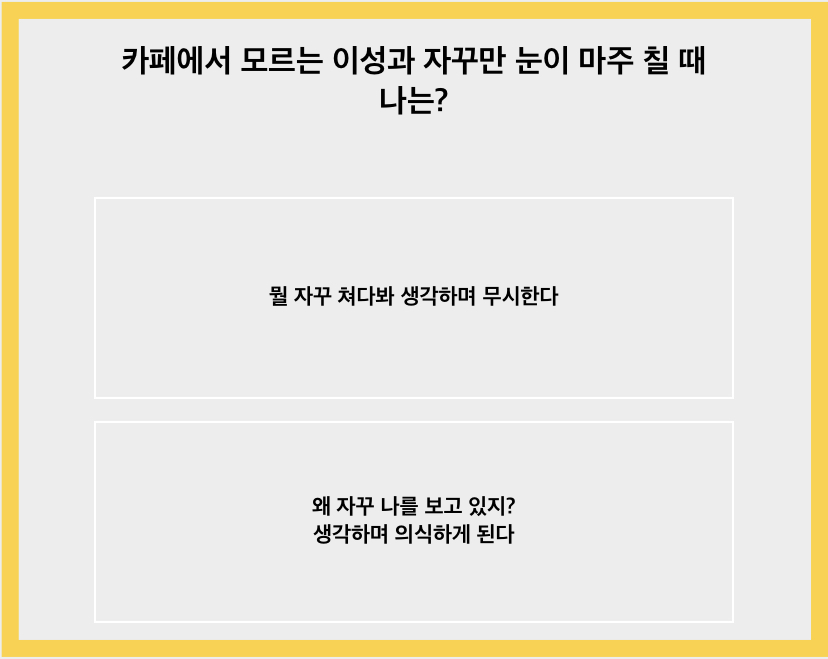 카페에서 모르는 이성과 자꾸 눈이 마주친다면 왜 자꾸 보는지 궁금해서 이런저런 생각에 잠길 것 같습니다.