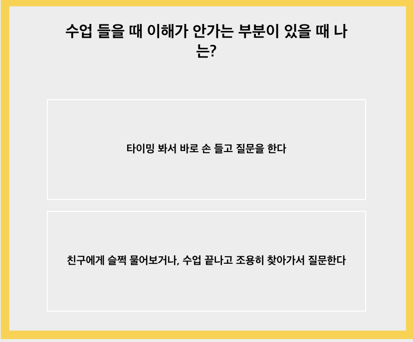 수업 들을 때 이해가 안 가는 부분이 있다면 친구에게 슬쩍 물어보거나 수업이 끝난 뒤 찾아가서 질문을 하는 편입니다. 손 들고 질문할까 수없이 고민하다가 타이밍을 놓친 경우도 종종 있었습니다.