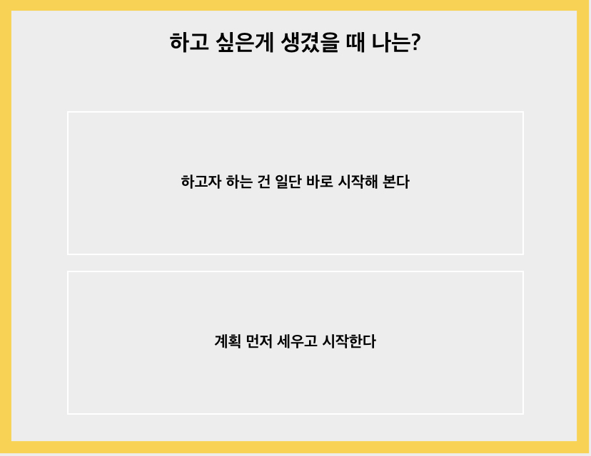 하고 싶은 게 생겼을 때 나는? 계획 먼저 세우고 차근차근 하나씩 해 나가는 편입니다. 저는 하고 싶은 일에 대한 계획을 세우는 것이 누구보다 즐거운 사람인 것 같습니다.