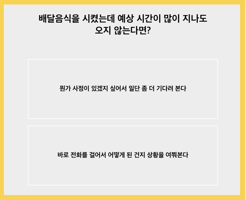 배달음식을 시켰는데 예상 시간이 많이 지나도 오지 않으면 일단 그래도 조금 기다려보다가 너무 많은 시간이 지나면 전화해서 상황을 설명하고 여쭤볼 것 같습니다.