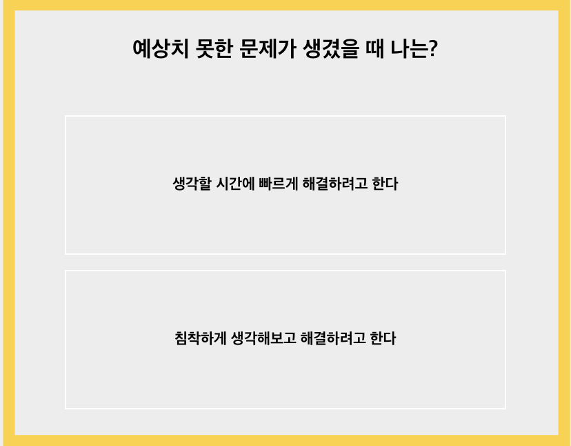 예상치 못한 문제가 생겼을 때 나는 침착하게 생각해 보고 해결하려고 할 것입니다. 빠르게 해결하다가 놓치는 게 있을지도 모른다는 생각도 들고 이런저런 앞뒤사정을 모두 판단해 본 뒤 행동에 옮깁니다.