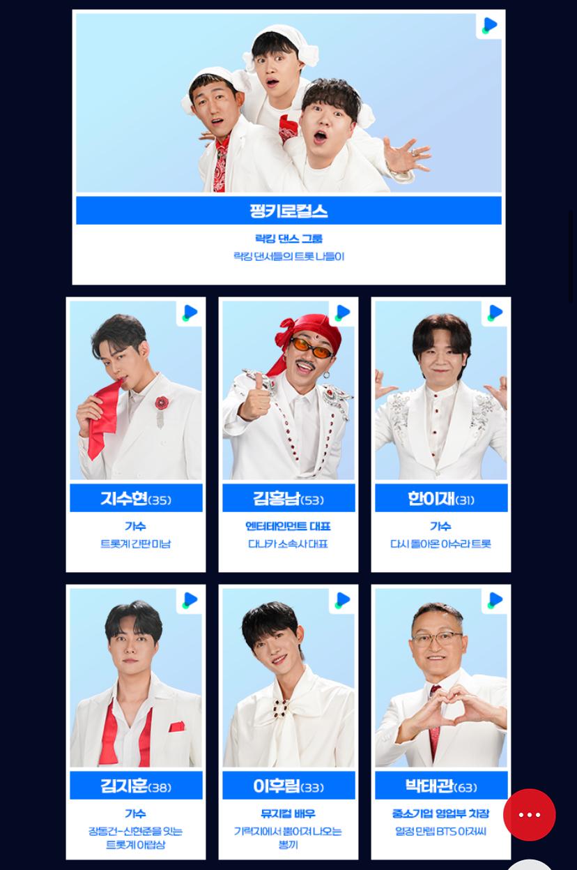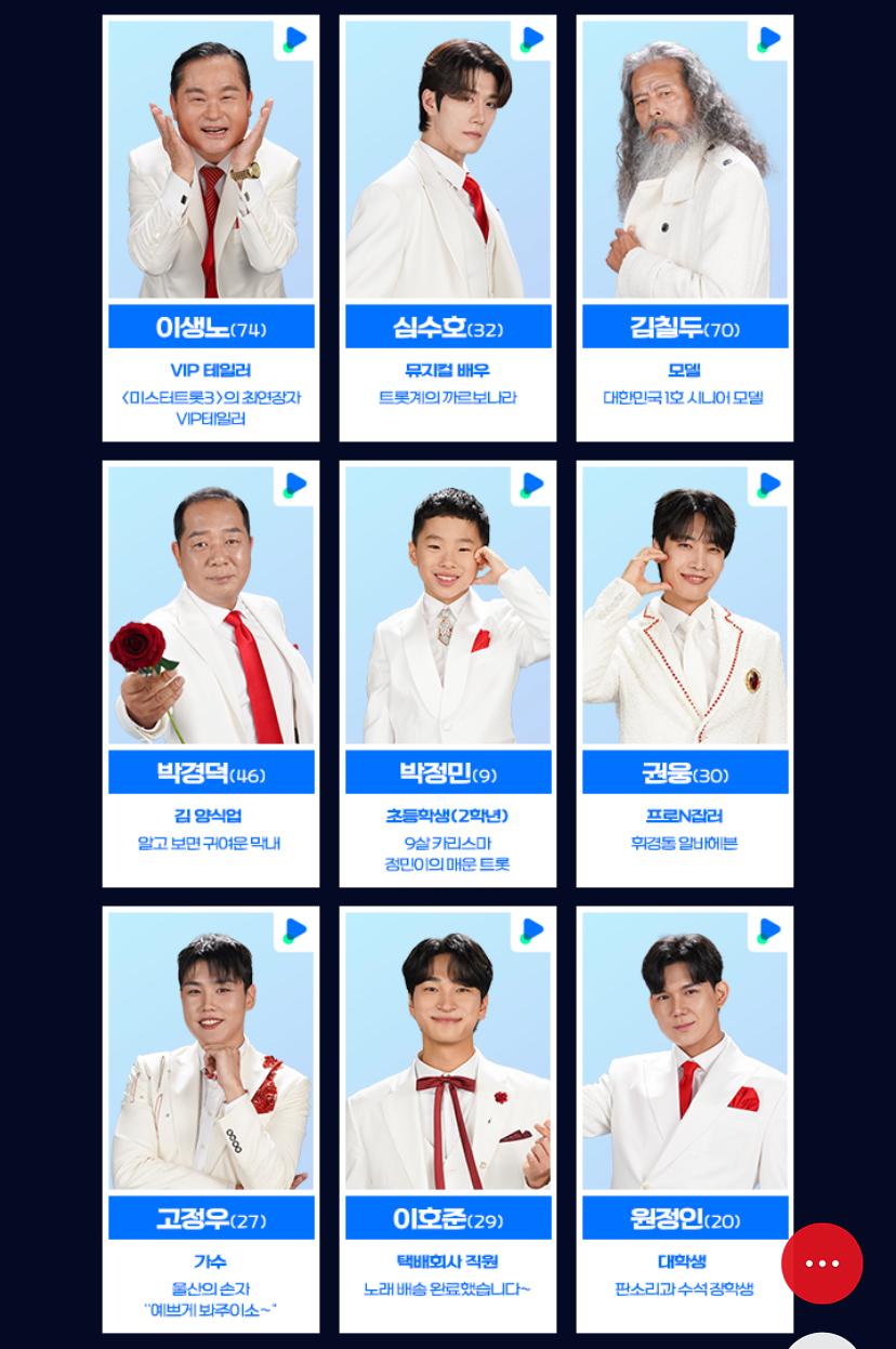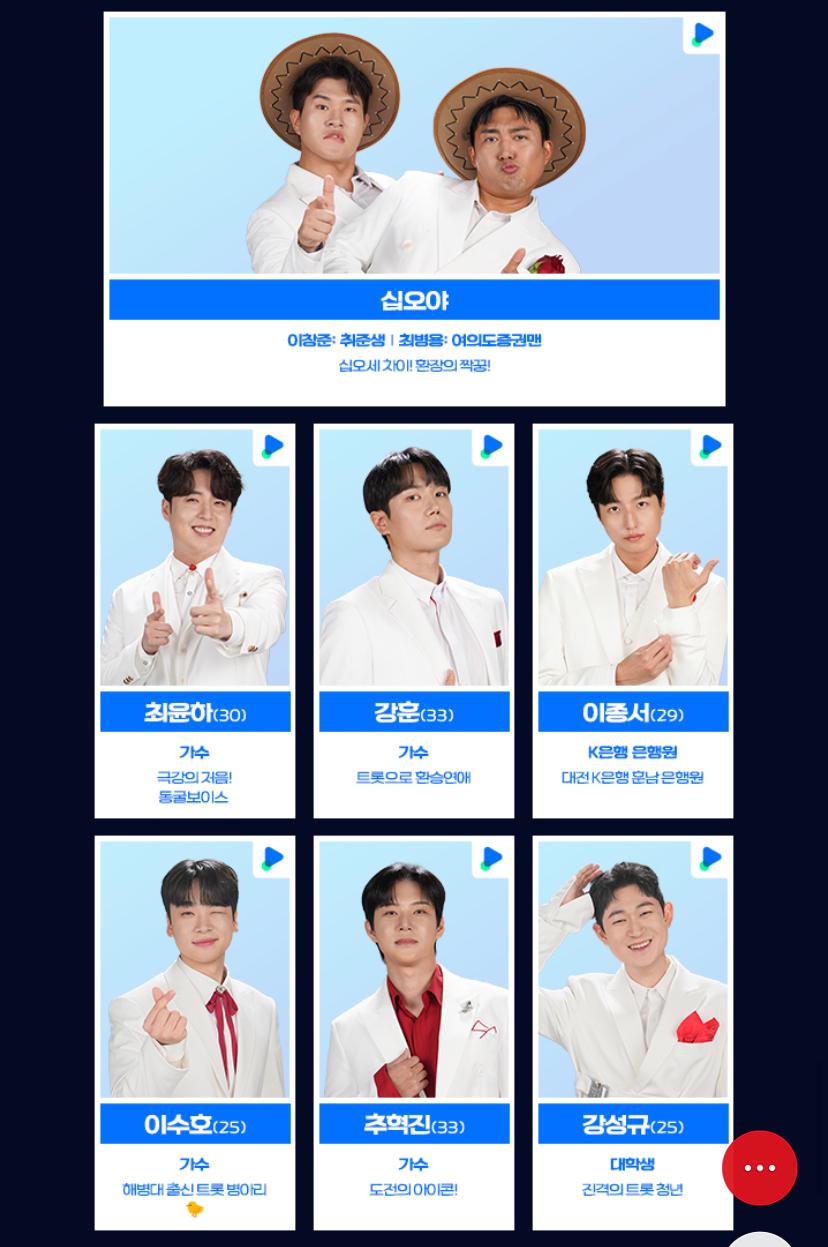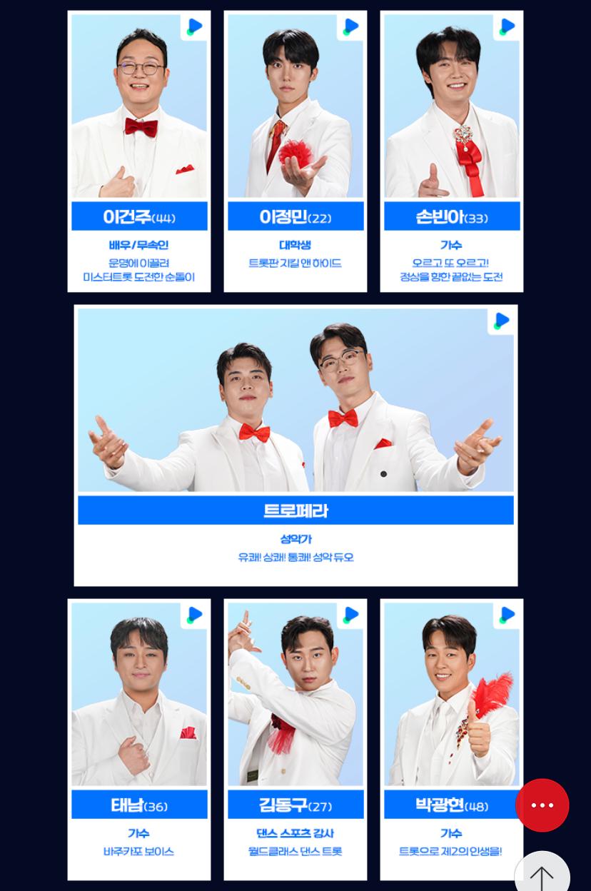 개그우먼 이은지, 가수 장민호, 영탁, 김희재, 이찬원, 정동원, 안성훈, 박지현, 나상도, 진욱, 박성온입니다.