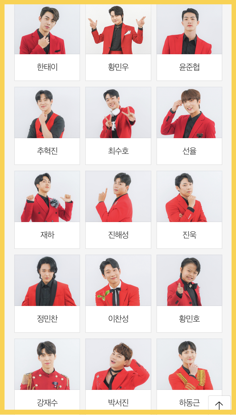 한태이, 황민우, 윤준협, 추혁진, 최수호, 선율, 재하, 진해성, 진욱, 정민찬, 이찬성, 황민호, 강재수, 박서진, 하동근