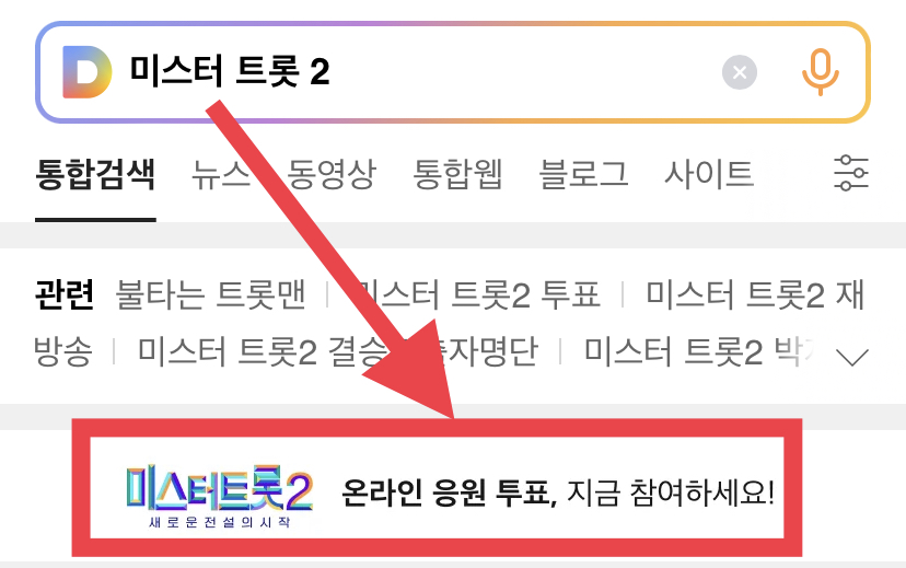 다음 메인 화면에서 미스터 트롯2를 검색하시면 상단에 미스터 트롯2 온라인 응원 투표, 지금 참여하세요! 배너가 보입니다. 배너를 눌러 들어간 후 보여지는 후보들 중 내가 응원하는 가수 7명을 선택하여 완료하시면 됩니다.