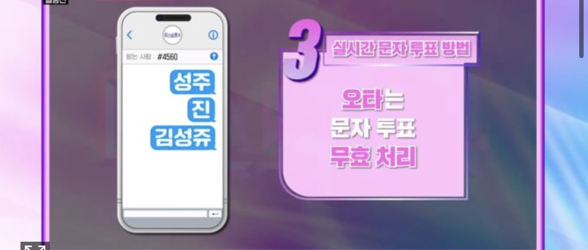 공정한 집계를 위해 동일한 참가자에게 여러 차례 문자를 보내는 중복 투표는 인정되지 않습니다. 다만 서로 다른 참가자에게 각각 한 번씩 투표하는 방식은 가능합니다.