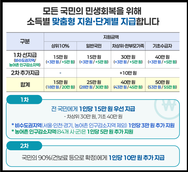 2차 지급은 9월 22일부터 10월 31일까지 진행되며 소득 상위 10%를 제외한 국민 90%에게 1인당 10만원이 추가로 지원됩니다.