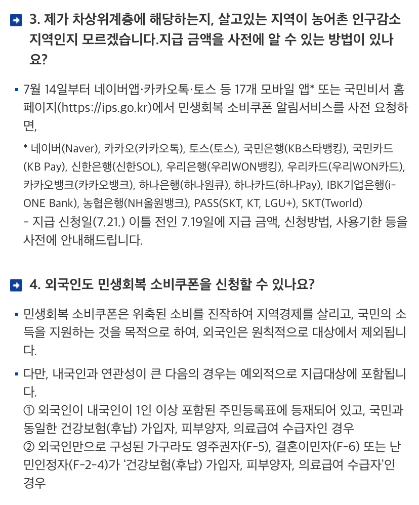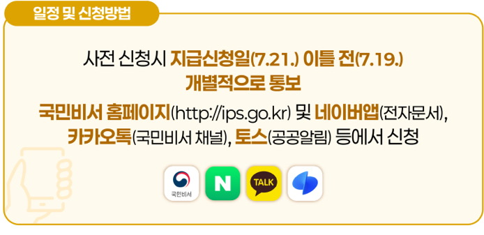 7월 14일부터 네이버앱‧카카오톡‧토스 등 17개 모바일 앱 또는 국민비서 홈페이지에서 민생회복 소비쿠폰 알림서비스를 사전 요청하면 지급 신청일(7.21.) 이틀 전인 7.19일에 지급 금액, 신청방법, 사용기한 등을 사전에 안내해드립니다.