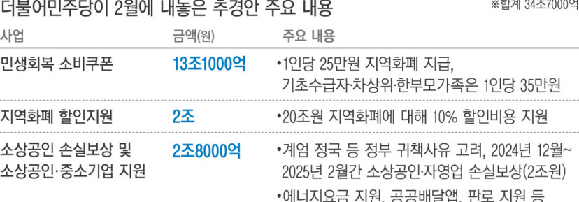 민주당은 35조원의 추경안을 제시하면서 민생 회복 예산 명목으로 국민 1인당 25만원씩 지역화폐로 지급하는 민생 회복 소비 쿠폰 사업 13조원과 지역화폐 할인지원 2조원, 상생 소비 캐시백 2조 4000억원, 8대 분야 소비 바우처 5000억원 등 소비 진작 4대 패키지를 말했습니다. 지역화폐 관련 사업만 15조원이 투입되는 것입니다.
