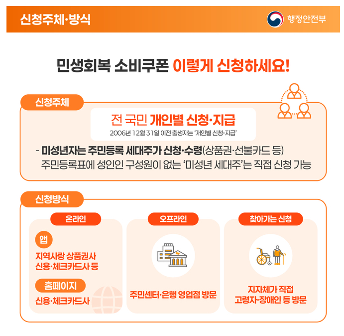 - 신청주체: 개인별 신청(미성년자는 주민등록 세대주사 신청 수령, 주민등록표에 성인인 구성원이 없는 미성년 세대주는 직접 신청)