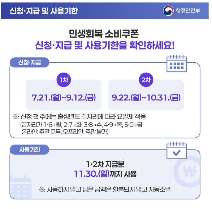 - 신청 및 지급 기간: (1차)2025년 7월 21일(월) ~ 9월 12일(금), (2차)2025년 9월 22일(월) ~ 10월 31일(금)
