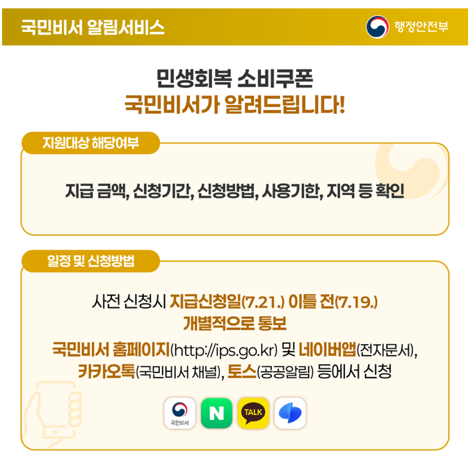 국민비서 알림서비스를 신청하면 자신이 받을 수 있는 금액과 신청방법 등을 미리 안내받을 수 있습니다. 해당 서비스는 7월 14일부터 네이버앱, 카카오톡, 토스, 국민비서 누리집에서 신청 가능하며, 신청자에게는 7월 19일 관련 정보가 제공됩니다.