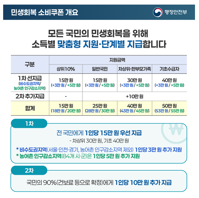 서울·경기·인천을 제외한 비수도권 거주자에게는 3만원, 84개 인구감소지역 주민에게는 5만원이 각각 추가 지급됩니다. 이에 따라 1차 지급에서 받을 수 있는 최대 금액은 45만원이며 기초 수급자가 인구감소지역에 살 경우 그 혜택이 가장 큽니다.
