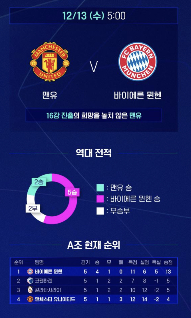 뮌헨과 마지막 조별리그 경기를 앞둔 맨유는 뮌헨, 코펜하겐, 갈라타사라이와 한 조를 이뤘렀는데요. 골 결정력 부재와 수비 불안으로 내리 패배하며 1승 1무 3패로 최하위로 떨어졌습니다.