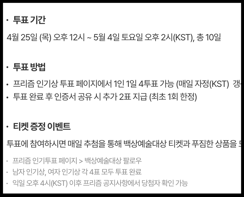 프리즘 인기상 투표 페이지에서 1인 1일 4투표 가능하며 투표 완료 후 인증서 공유 시 추가 2표를 지급합니다.