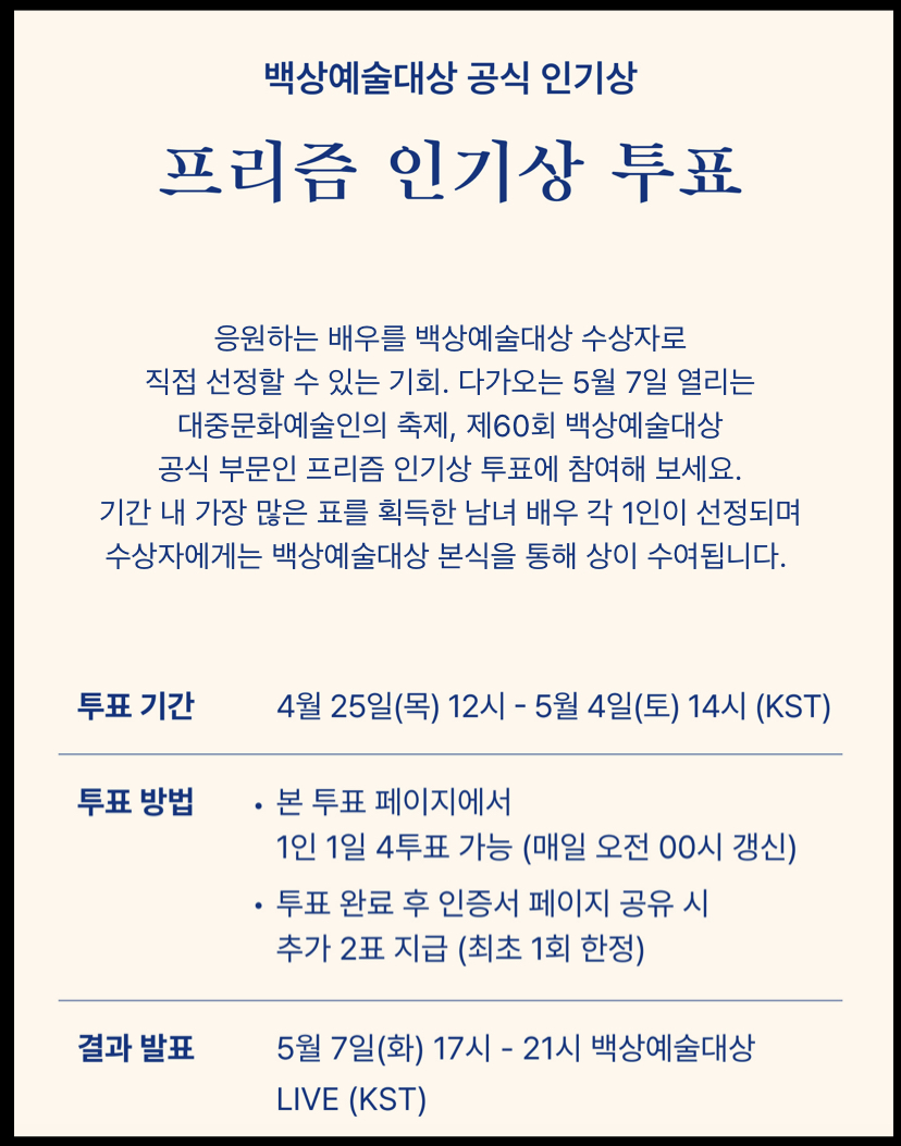 프리즘 인기투표 페이지에서 백상예술대상을 팔로우하고