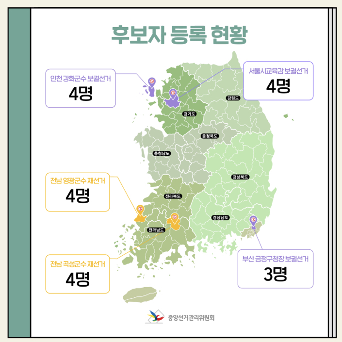 후보자 등록 현황은 서울시교육감 4명, 인천 강화군수 4명, 전남 영광군수 4명, 전남 곡성군수 4명, 부산 금정구청장 3명입니다.