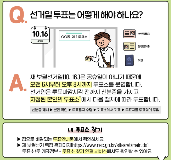 보궐선거 선거일 투표일인 10월 16일은 공휴일이 아니기 때문에 오전 6시부터 오후 8시까지 투표소를 운영합니다.