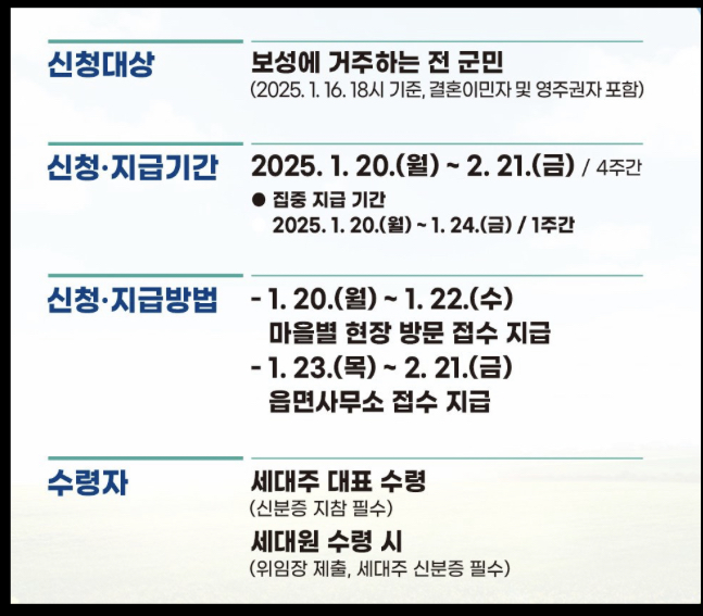 보성사랑지원금을 수령하지 못한 군민은 1월 23일(목), 24일(금) 2일간 읍면사무소에서 신청 즉시 지급할 예정입니다.