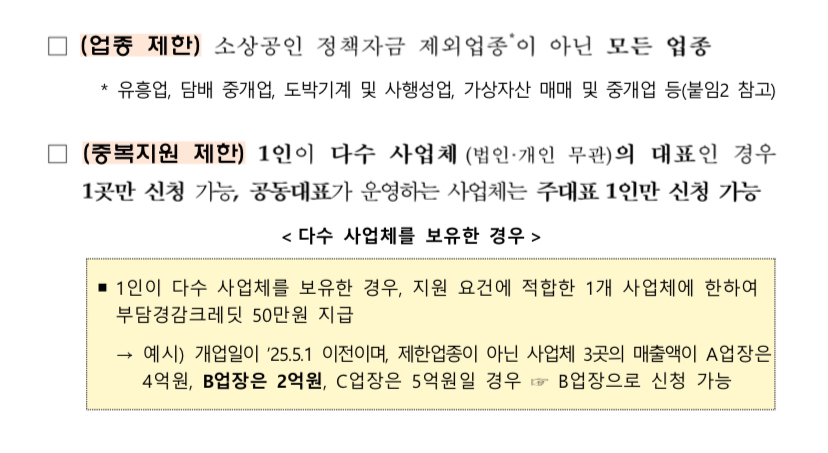 예시) 개업일이 ’25.5.1 이전이며, 제한업종이 아닌 사업체 3곳의 매출액이 A업장은 4억원, B업장은 2억원, C업장은 5억원일 경우 B업장으로 신청 가능