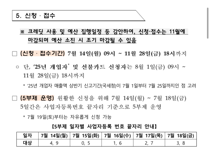 접수 초기 혼잡을 방지하기 위해 7월 18일까지는 사업자등록번호 끝자리 기준 5부제를 운영합니다.
