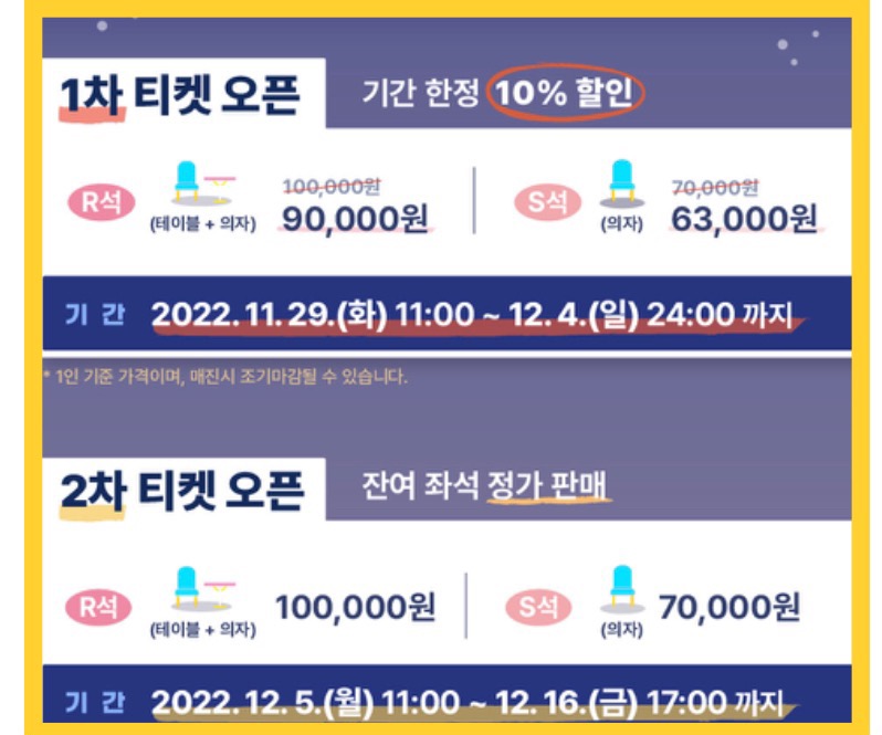 R석(테이블+의자) 100,000원, S석(의자) 70,000원